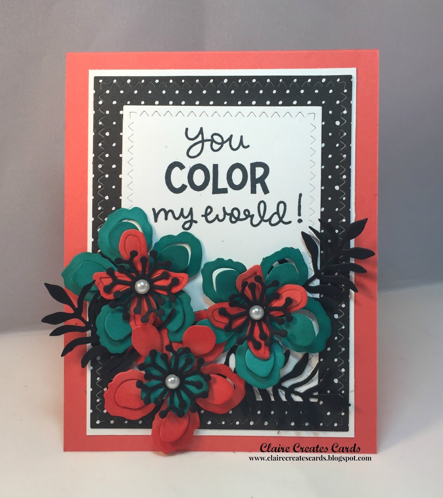 ReplyDeleteLove, love, love those bold flowers against the black and white background Claire - just fabulous! So much dimension too - a great card!