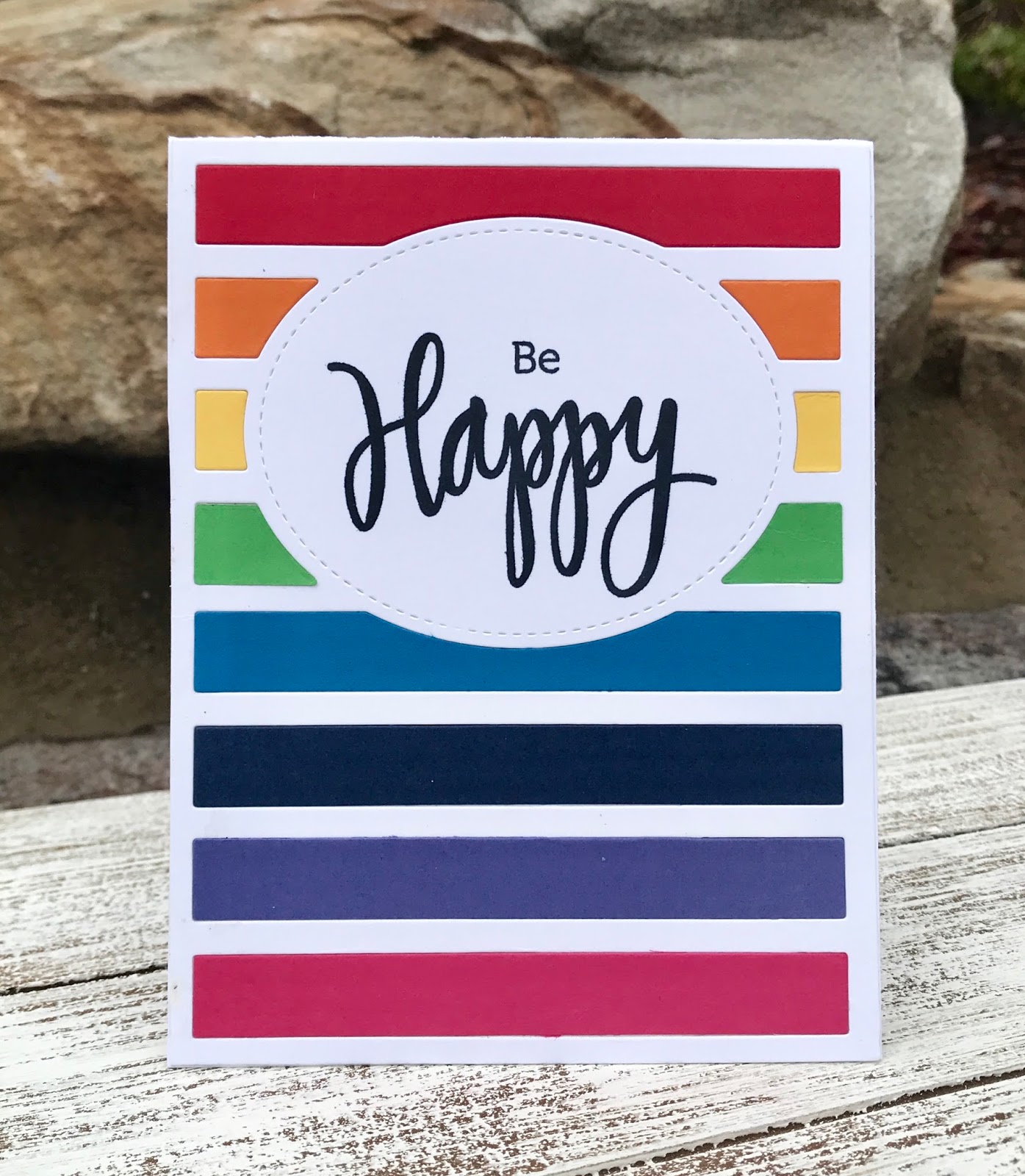 My card is created on a white card base. I cut the frame using the SugarPea Designs large striped cover plate.  I ran it through my Big Shot 8 times using red, orange, yellow, green, blue, indigo, violet and pink. I added a strip of each color in the frame. The sentiment is stamped in black. A very simple CAS card to bring someone special a smile.