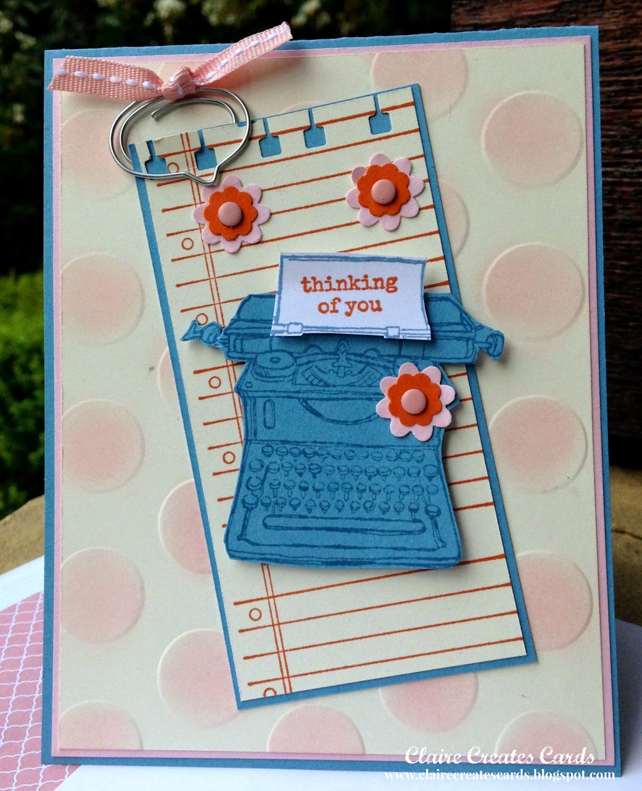 I wanted to use the Tap, Tap, Tap Stamp Set this week on my card. When I saw Marina Mist was one of the colors in the combo, I knew it was the right choice. When I was in college, there were no computers---ok I know that I am OLD----my roommate had a trusty blue typewriter that we shared and wrote a lot of papers on. I remember many late nights trying to get a paper done. --- The professors would NOT let you use erasable paper, so it never failed that I would get to the last line and have to start over. So, my card is in memory of the old, blue typewriter! ENJOY!