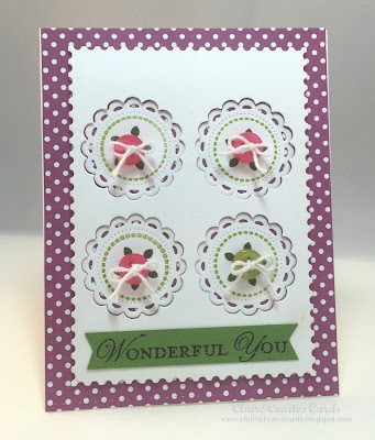 My card was created on a white card base. I cut a piece of Rich Razzleberry DSP with the Mama Elephant dies for the background. A piece of white card stock was cut with the Mama Elephant dies. I used My Creative Time stitched doily dies and cut four circles in the design of the sketch. I added the white panel with foam tape for dimension. I then placed the white doilies down inside the circles. I added four buttons with white twine for bows.