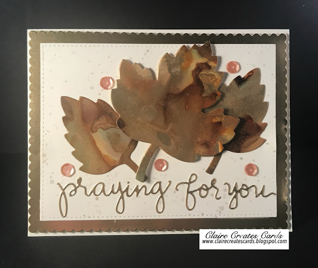 Unfortunately, I needed a sympathy card. I decided to play on the diagonal silver/gold-die-cut/punch/ fall. I created an alcohol ink background and then cut out the leaves using the Stampin' Up! Vintage Leaves dies. My card base is white. I cut a scalloped background from gold foil. I splattered the white stitched layer with gold ink. The leaves were added with dimensionals. A few sequins were added for sparkle. The gold sentiment is from Simon Says Stamp "Praying for you". The picture is not great with the shine--sorry!