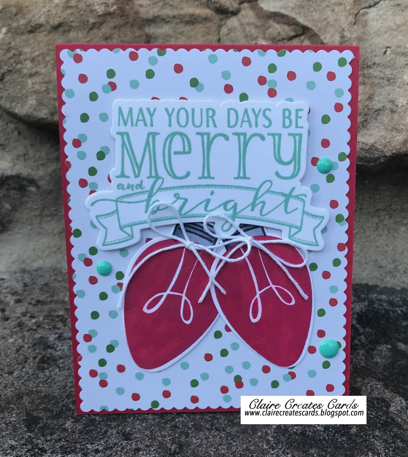 All of my cards are created on a 4 1/4 X 5 1/2 card bases. I went through my stash and pulled out a few pieces of patterned paper that I had on my table top. I cut each one using a retired MFT scalloped border die. I stamped the sentiment using W Plus 9 Be Merry stamp set. I stamped the sentiment 6 times in different colors of ink to match the backgrounds I chose. I cut the sentiment out using the matching die. I adhered the sentiment to each background using dimensionals. I stamped a variety of retro light bulbs using the Reverse Confetti Merry & Bright stamp set. I cut them out with the matching die. I adhered two to each card and colored the tops with Copic Markers C1 and C3. I added Wink of Stella to the bulbs and a twine bow at the top of each one.