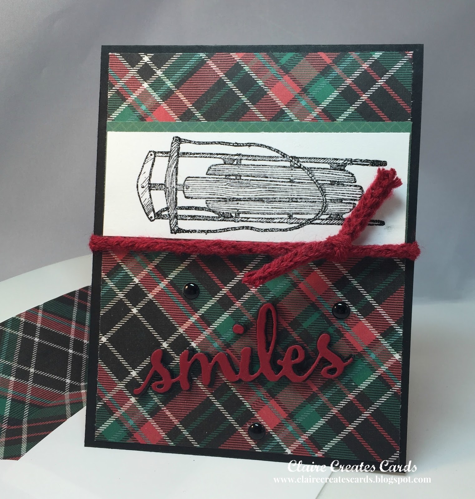 I am a huge fan of plaid and it is in "STYLE" again! Preppy at it's finest! YIPPEE! My base card is black. The plaid paper is from Paper Studio. I found it in my stash. I used a strip of green patterned paper from the Carta Bella paper pack. The sled from Winter Wishes (Stampin' Up!) was stamped in black Versa Fine ink and heat embossed with clear embossing powder.